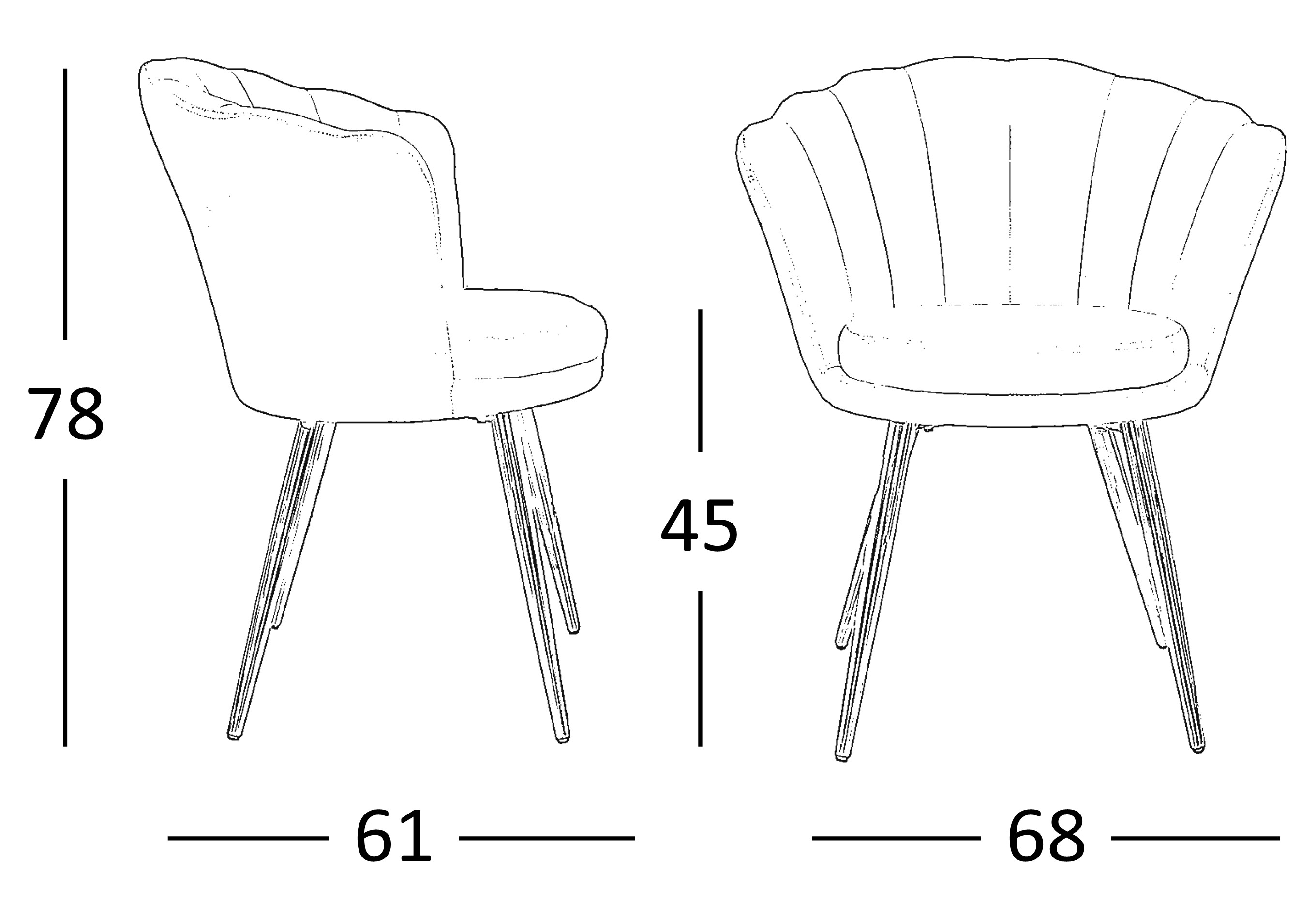 La forma a conchiglia, disegnata da uno schienale avvolgente i cui contorni sono sagomati in una serie di curve verticali che ricordano i raggi di una conchiglia, è sostenuta da una solida struttura di acciaio fatta di gambe sottili e affusolate color oro, che aggiungono un tocco di glamour e leggerezza al design.